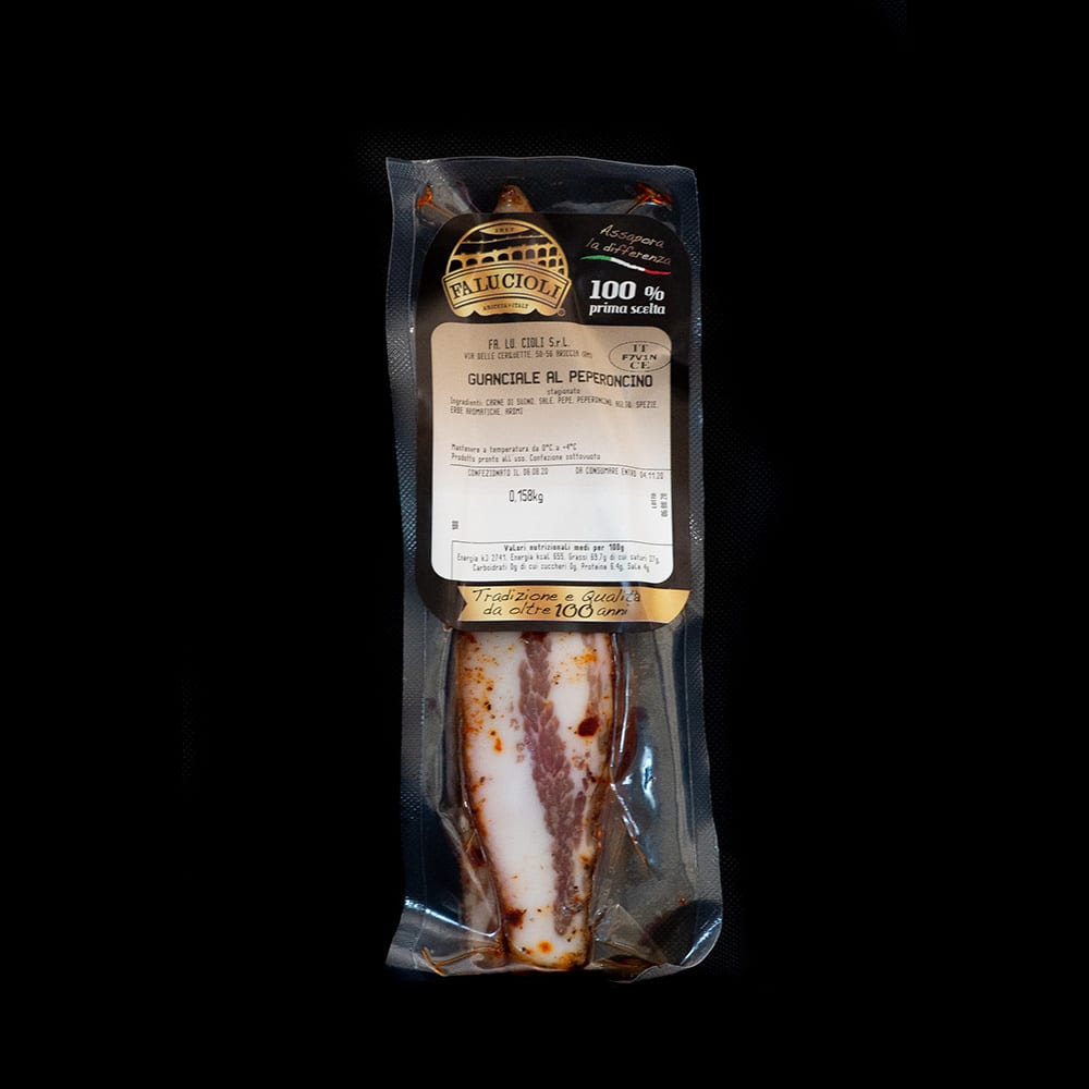 Dalla nostra tradizione il guanciale di maiale รจ una prelibatezza di gusto prodotto dalla guancia del maiale, un pezzo di carne percoso dalle nervature magre (muscolo) con una componente di grasso pregiato di diversa composizione dal lardo (grasso del dorso) e dalla pancetta (grasso del ventre). La consistenza รจ piรน dura rispetto alla pancetta e il sapore caratteristico.